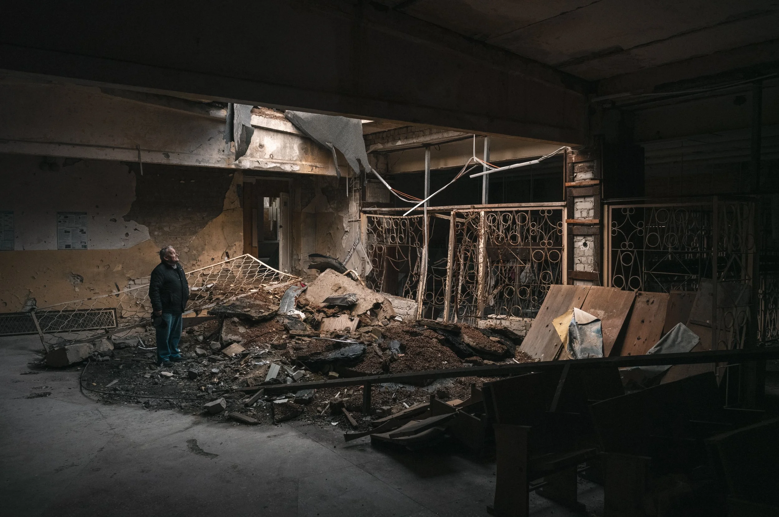 Oleksander Grianyk, principal of Kharkiv School Number 62, stands in the damaged lobby, recounting the night of April 8, 2022, when the school in Piatyhatky was heavily bombed.