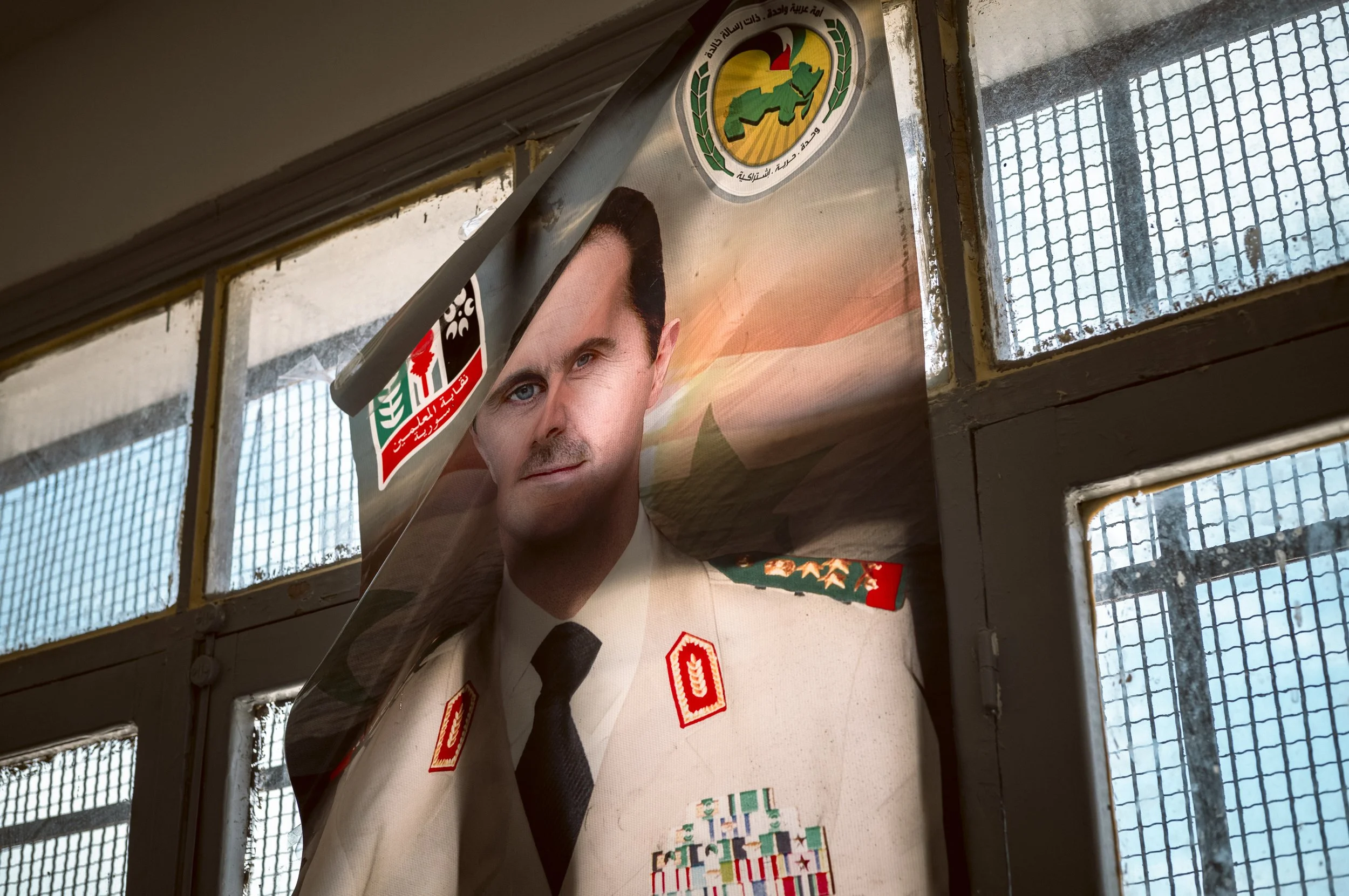 A photograph of Bashar al-Assad hangs in front of a window of a school in rural Raqqa. In areas under government control in Syria, it's inescapable to encounter images of the autocratic leader.